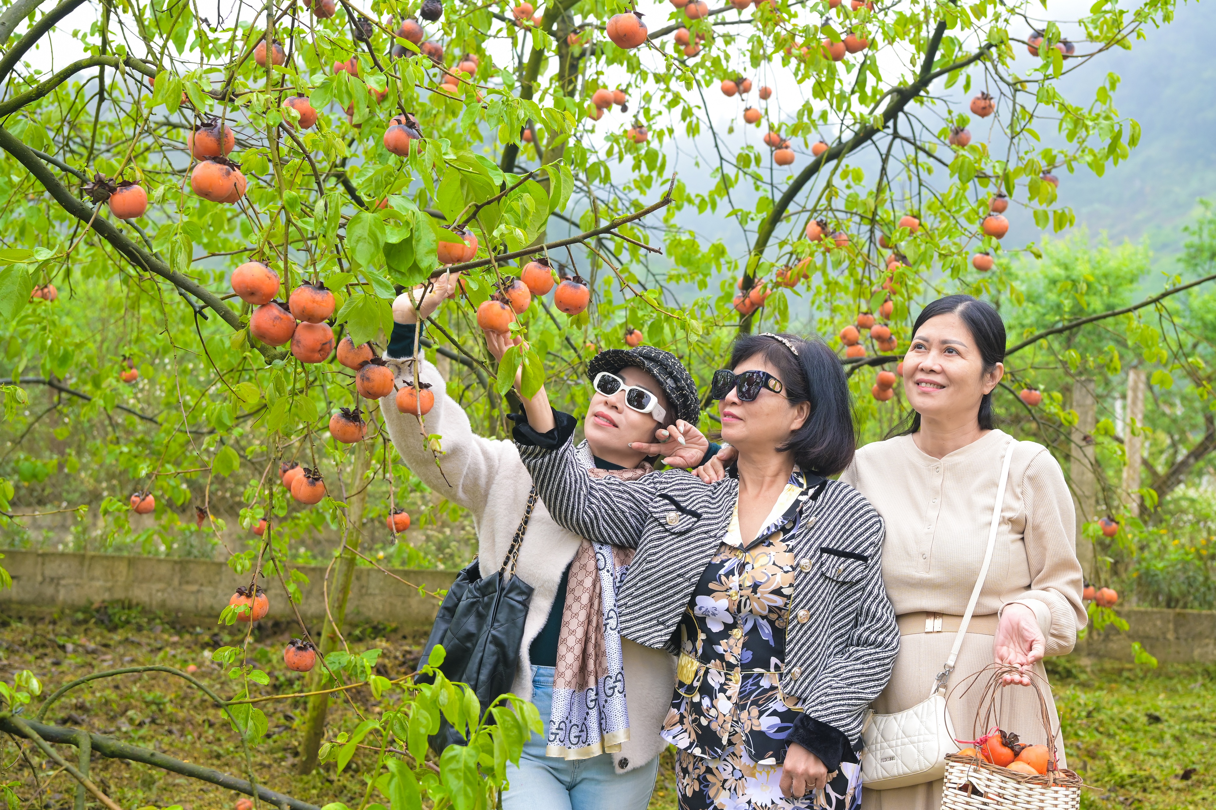 Một điểm dừng chân ấn tượng khác là Đồi chè Trái Tim – biểu tượng đặc trưng của cao nguyên Mộc Châu. Những đồi chè xanh mướt uốn lượn thành hình trái tim không chỉ tạo nên khung cảnh nên thơ mà còn là niềm tự hào của người dân địa phương. Tại đây, các nữ cán bộ, công nhân viên đã có dịp tìm hiểu về nghề trồng và chăm sóc chè – một nét đặc trưng trong đời sống kinh tế và văn hóa của vùng đất Mộc Châu. Hành trình còn đưa đoàn đến với vườn hồng trĩu quả, nơi những cây hồng sai quả tạo nên khung cảnh yên bình, đặc trưng của vùng núi Tây Bắc mỗi dịp vào mùa.
