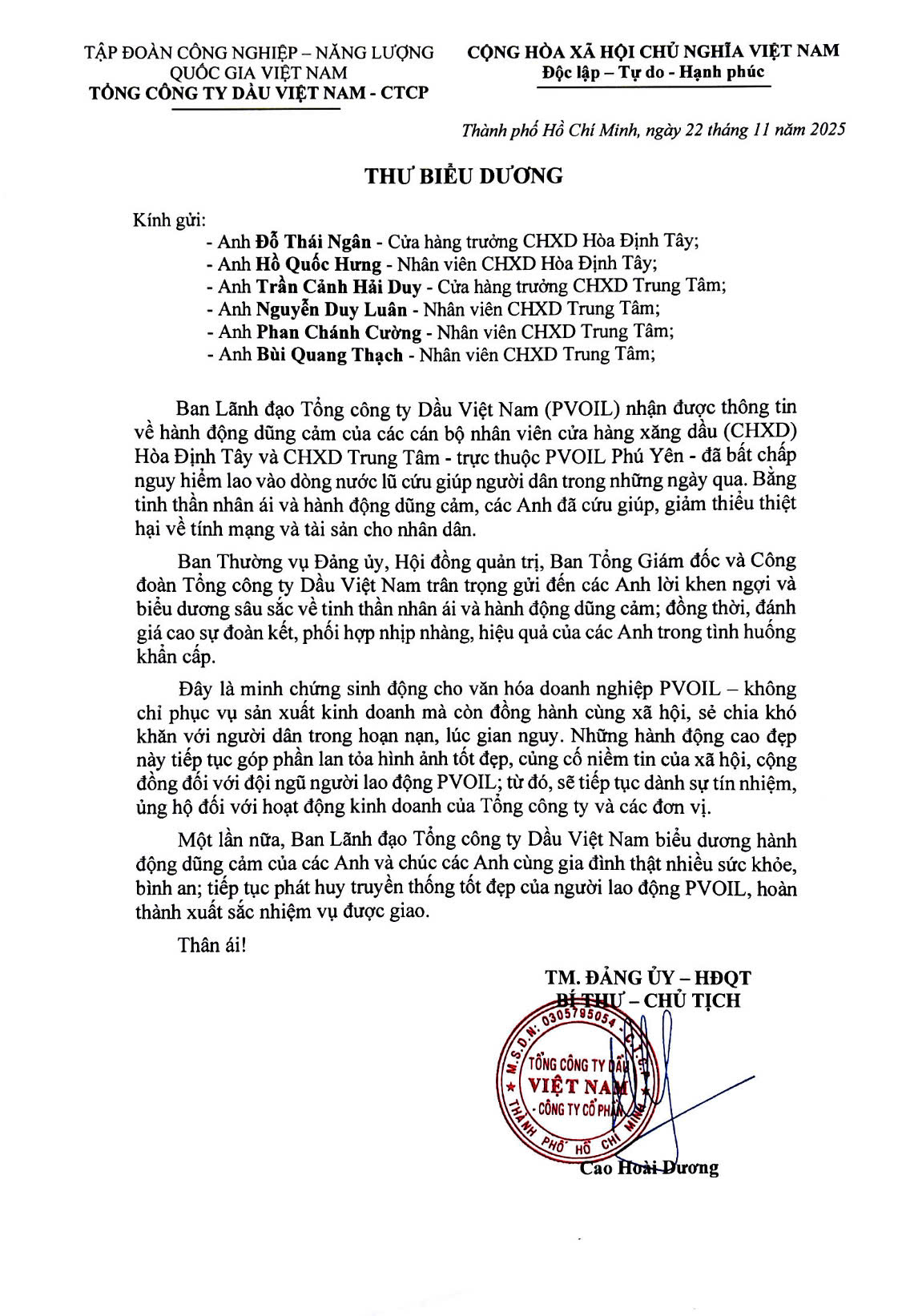 The selfless actions of PVOIL Phu Yen employees not only saved lives but also strongly conveyed the compassionate spirit and resilience of PVOIL and Petrovietnam workers—true role models deserving praise and further recognition.