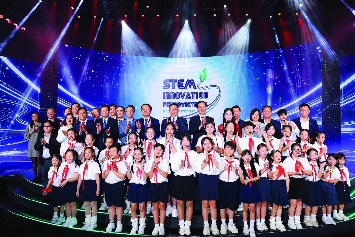 Quyền Bộ trưởng Bộ Công Thương Lê Mạnh Hùng, Chủ tịch HĐTV Petrovietnam Lê Ngọc Sơn, Phó Bí thư thường trực Đảng ủy Tập đoàn Trần Quang Dũng và các em học sinh tham dự chương trình cầu truyền hình trực tiếp “Mạch nguồn tri thức - STEM Innovation Petrovietnam”.