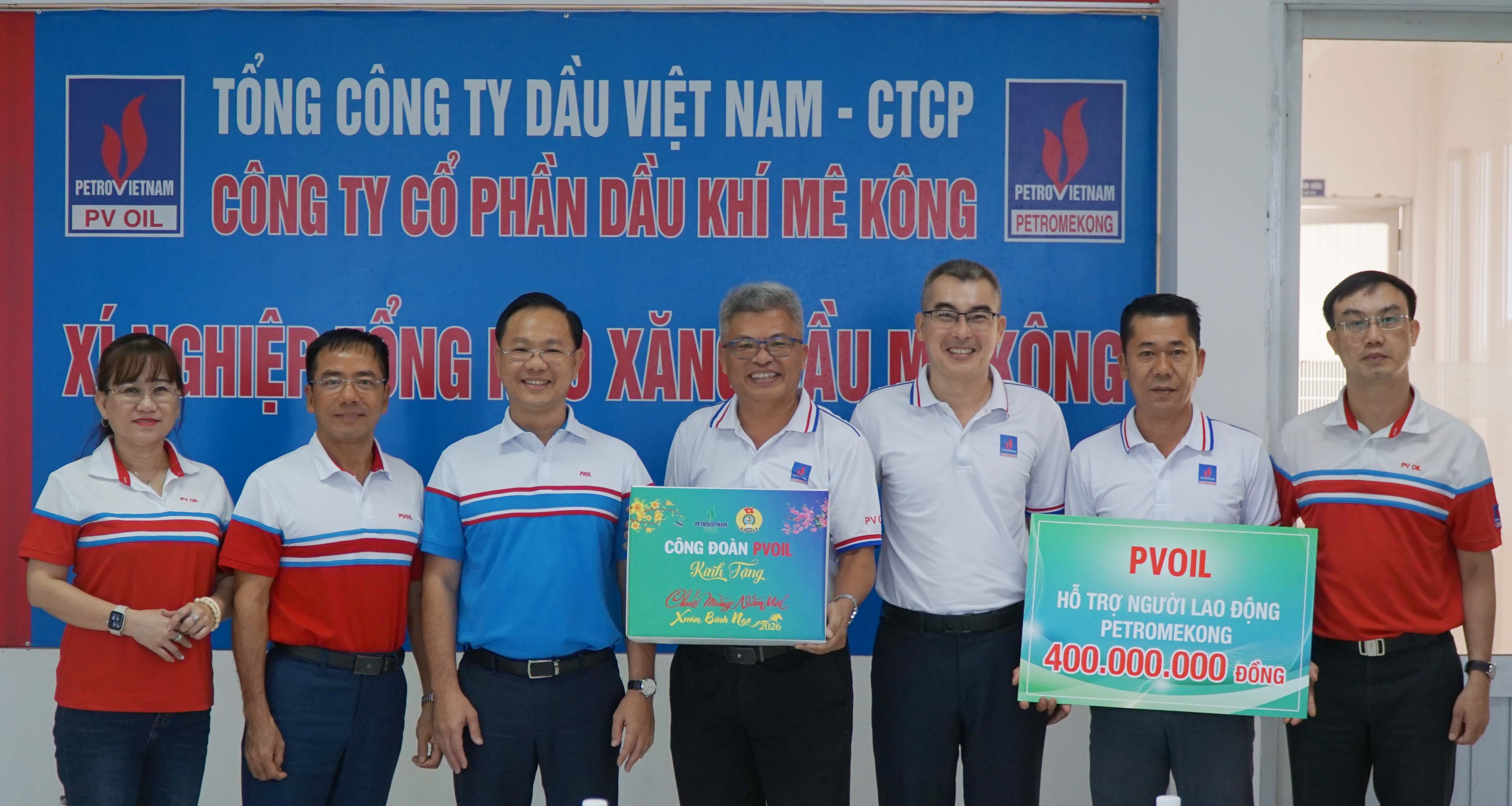 Đoàn công tác đã trao hỗ trợ 400 triệu đồng để Công ty Petromekong tặng quà Tết cho 200 người lao động có hoàn cảnh khó khăn. Hoạt động sẻ chia thiết thực này đã góp phần thắt chặt tình đoàn kết và tinh thần gắn bó dưới “mái nhà chung” PVOIL.