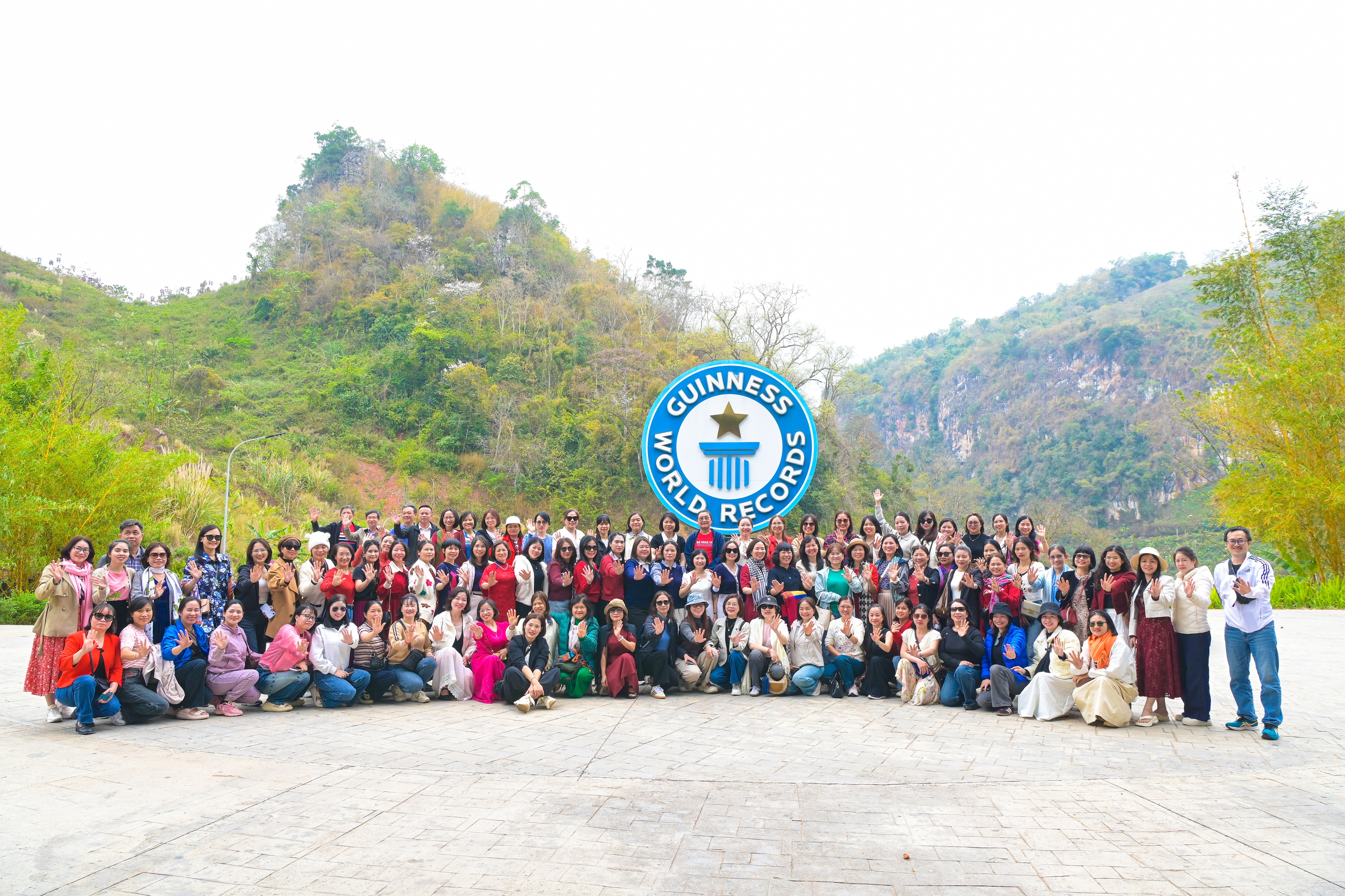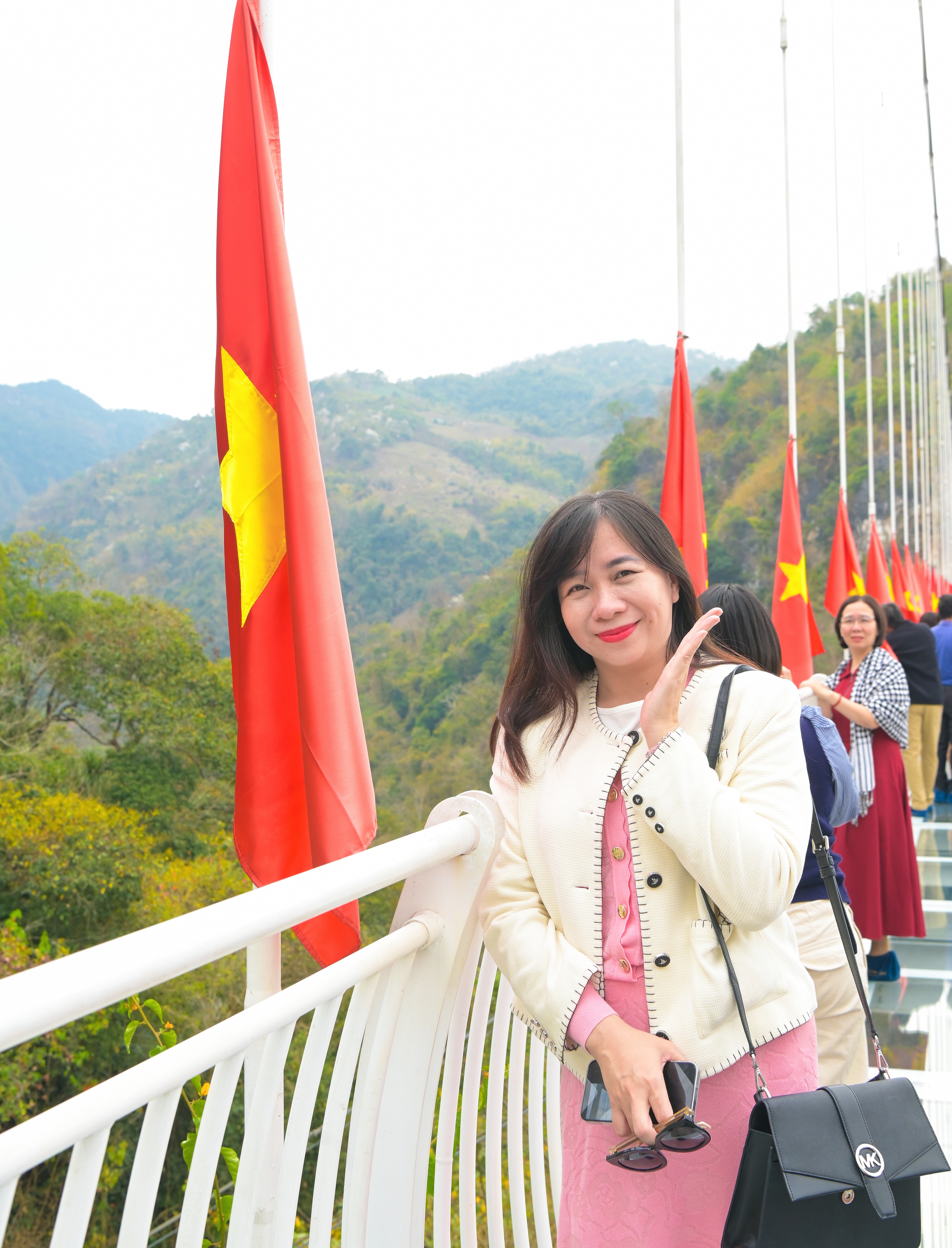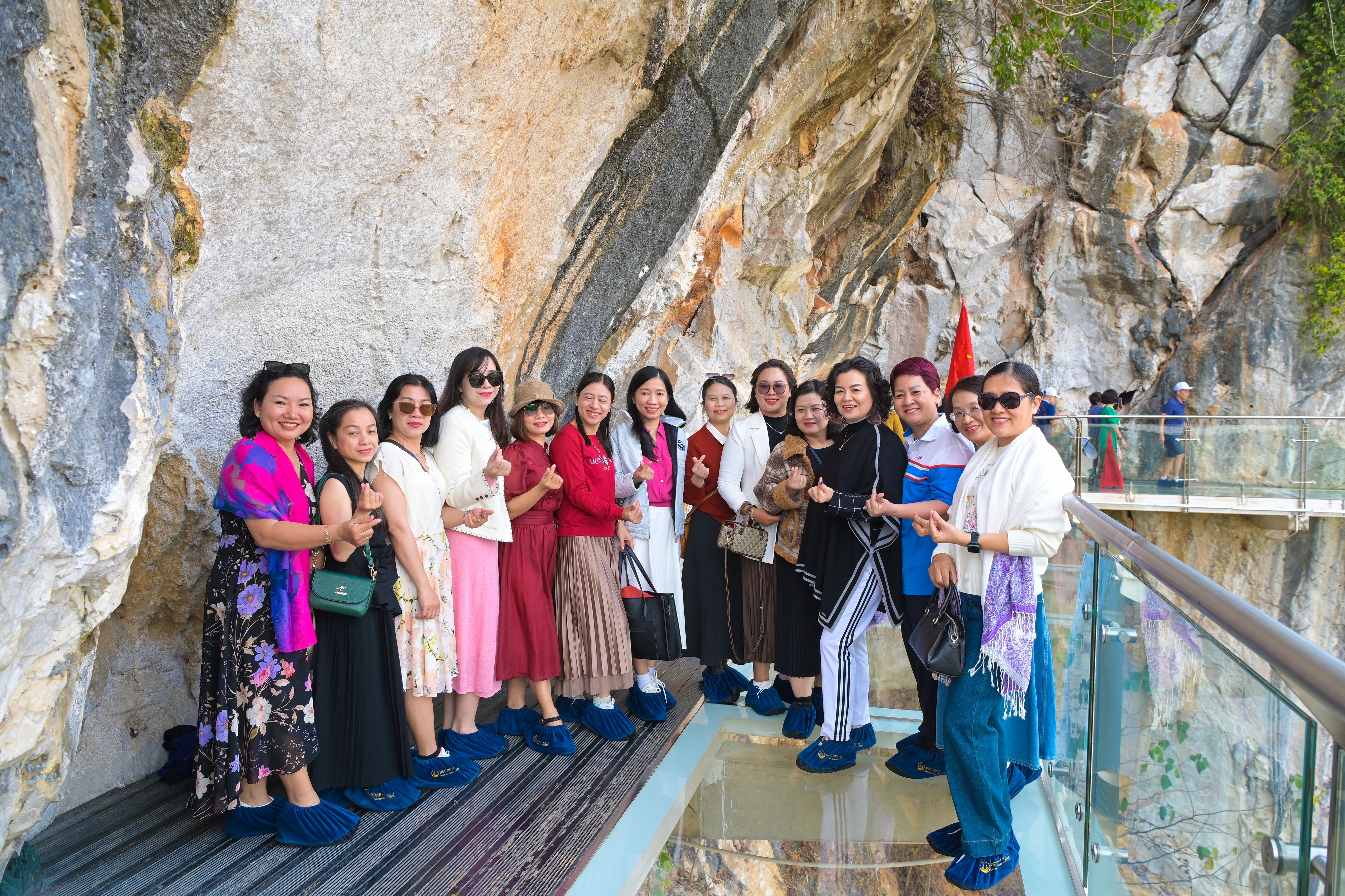 Các nữ cán bộ, công nhân viên chụp ảnh lưu niệm tại Cầu Kính Bạch Long được Tổ chức Kỷ lục Guinness thế giới trao chứng nhận là cầu kính đi bộ dài nhất thế giới.Trong khuôn khổ chương trình, các nữ cán bộ nhân viên đã tham gia nhiều hoạt động tham quan, trải nghiệm tại những địa điểm nổi tiếng của vùng Tây Bắc.