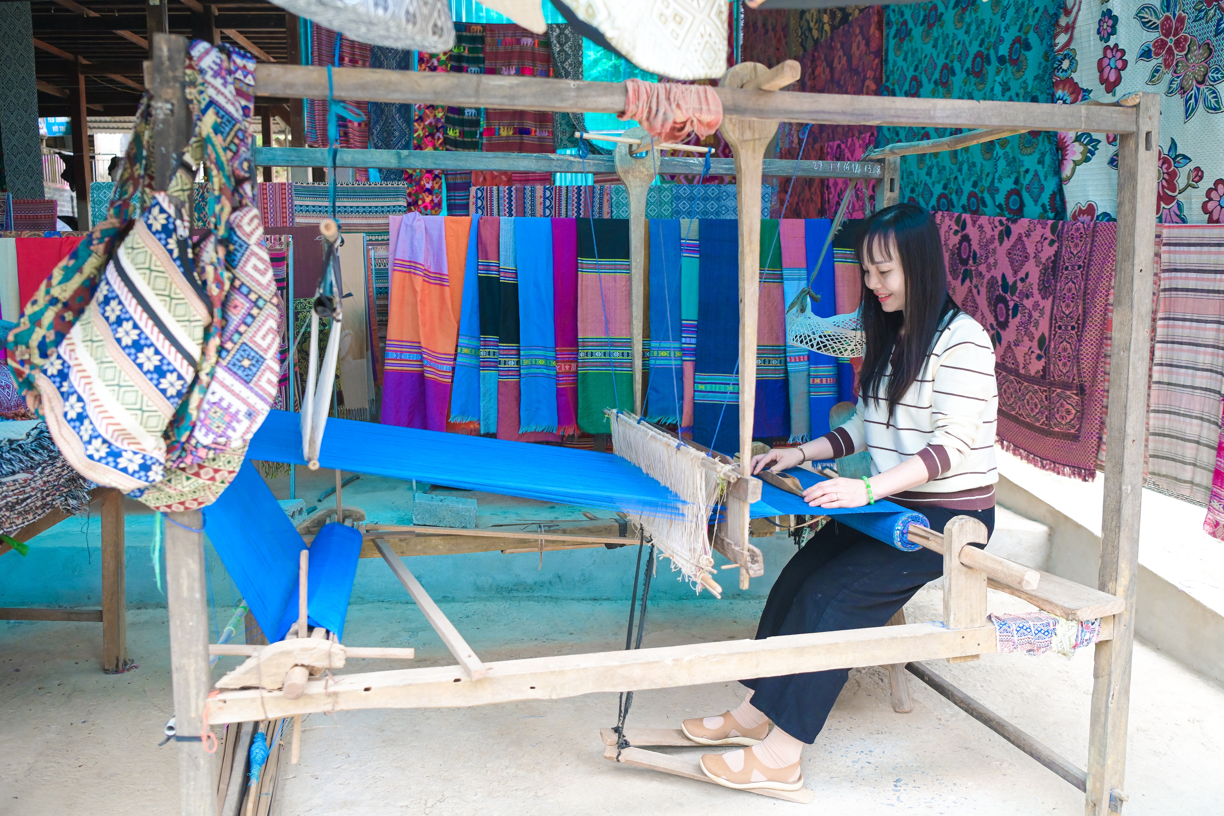 Người lao động nữ của PVOIL trải nghiệm hoạt động đan dệt truyền thống tại Bản Lác
