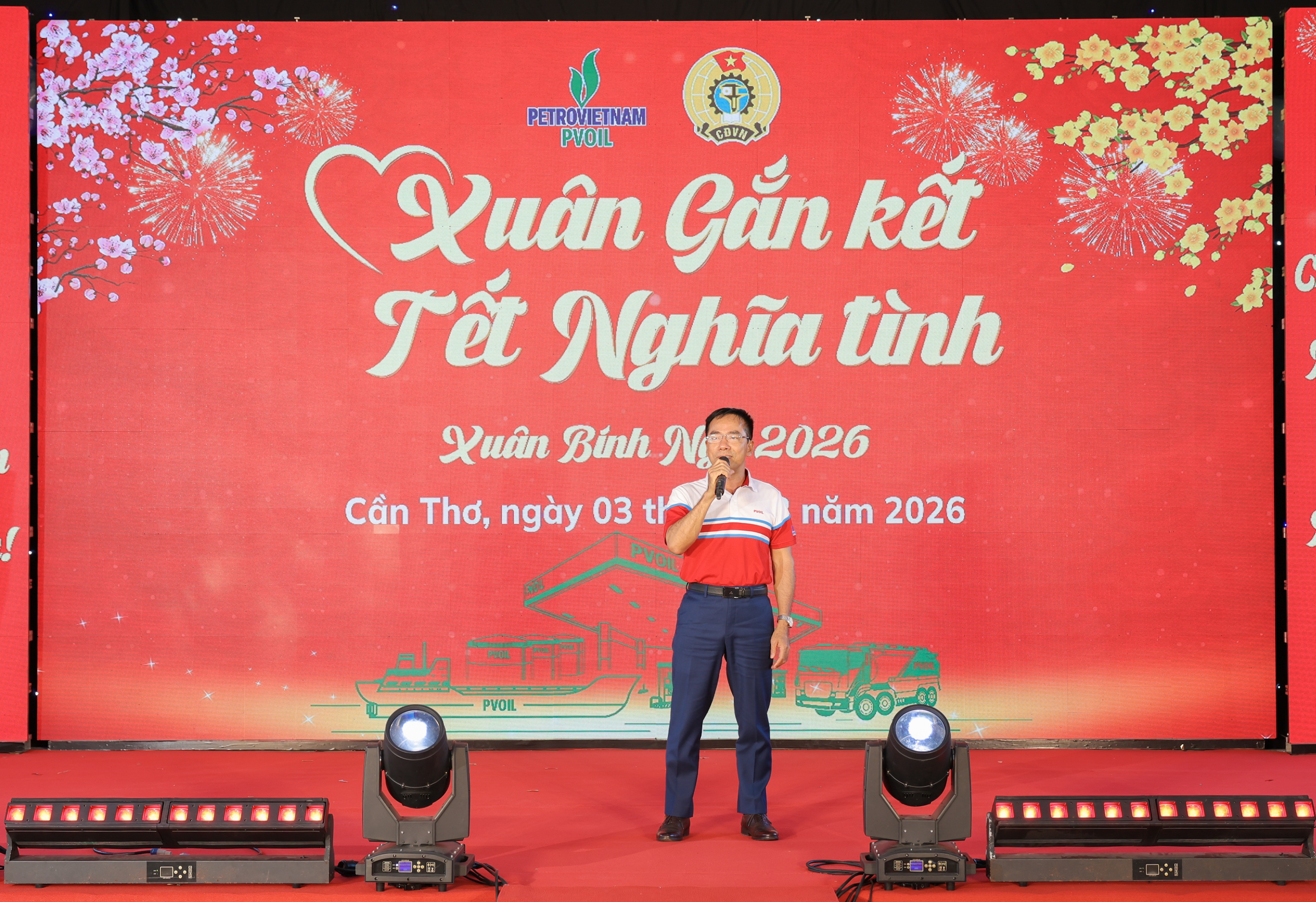 Với chủ đề “Xuân gắn kết – Tết Nghĩa tình” của Tập đoàn Công nghiệp - Năng lượng Quốc gia Việt Nam (Petrovietnam), Tổng công ty Dầu Việt Nam (PVOIL) thông qua Công đoàn Tổng công ty đã tổ chức chương trình mừng Xuân Bính Ngọ cho người lao động tại Xí nghiệp Tổng kho Xăng dầu Mê Kông (Petromekong) vào ngày 03/2/2026. Buổi gặp gỡ cuối năm có sự tham gia của hơn 200 người lao động, đại diện cho hơn 800 cán bộ công nhân viên thuộc các đơn vị thành viên PVOIL đang hoạt động kinh doanh trên địa bàn miền Tây Nam bộ gồm: Petromekong, Petec, PVOIL Bạc Liêu, PVOIL Sài Gòn, PVOIL Trans.